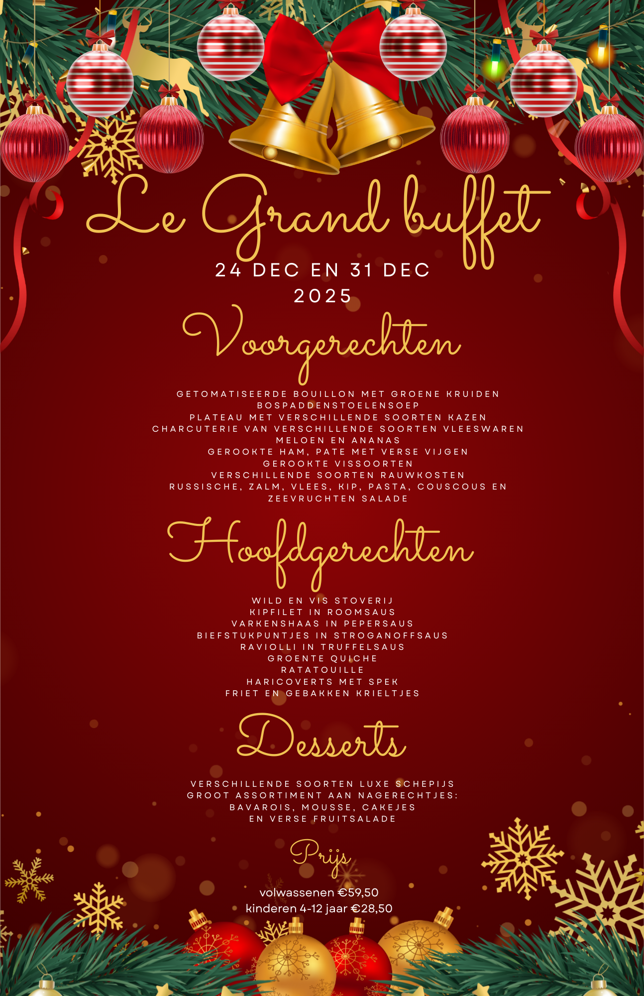 Geniet van ons βLe Grand Buffetβ met een overvloed aan feestelijke gerechten β van fijne voorgerechten tot smaakvolle hoofdgerechten en luxe desserts.